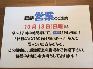 10月18日(日曜)9~17時の時間帯で営業致します。