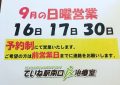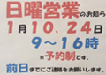 10日、24日の二日間は、9~16時の時間にて営業致します。尚、日曜営業は予約制とさせていただいておりますので、前日の土曜…